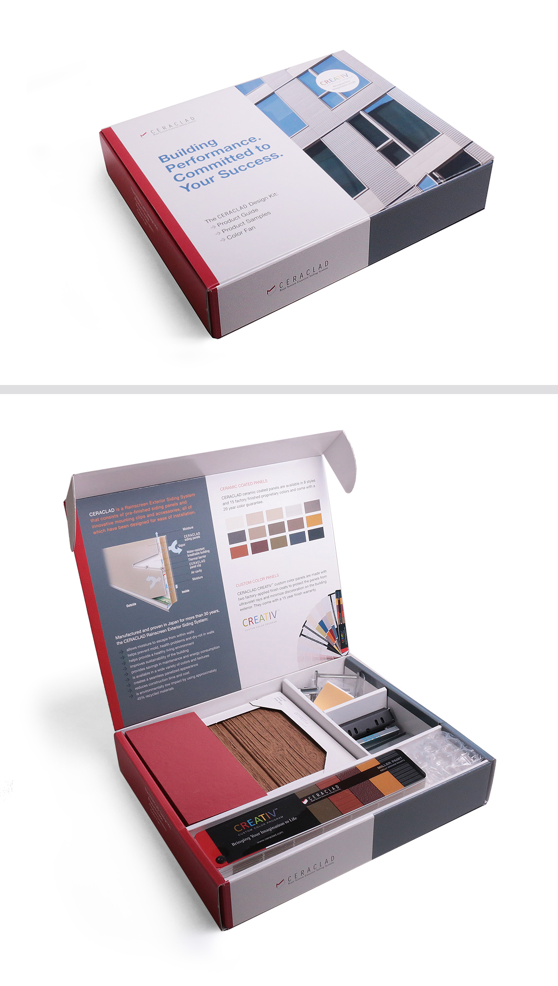 We designed a custom Ceraclad Design Kit for the sales team as a leave behind for architects and developers. The box holds the Ceraclad custom color fan, actual samples of their siding product and mounting hardware.