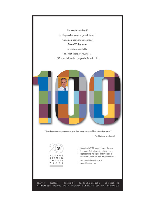 For their 20th anniversary we designed a commemorative logo and a print ad acknowledging principal Steve Berman's inclusion in The National Law Journal's 100 Most Influential Lawyers in America.