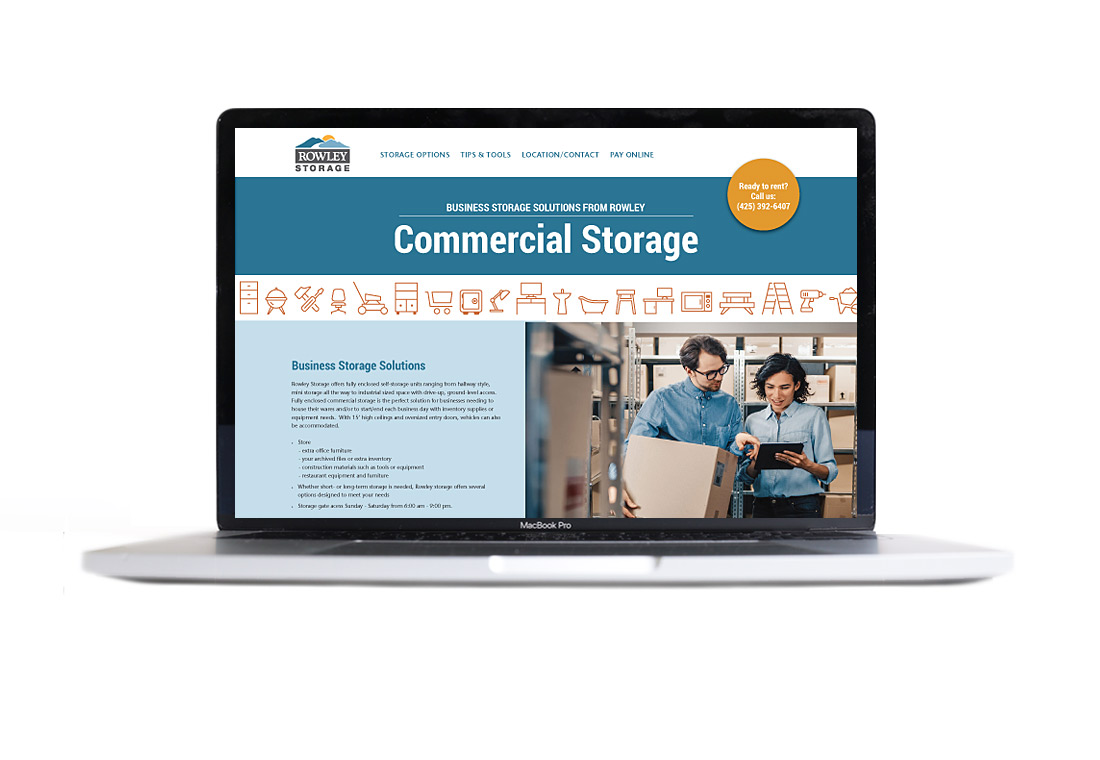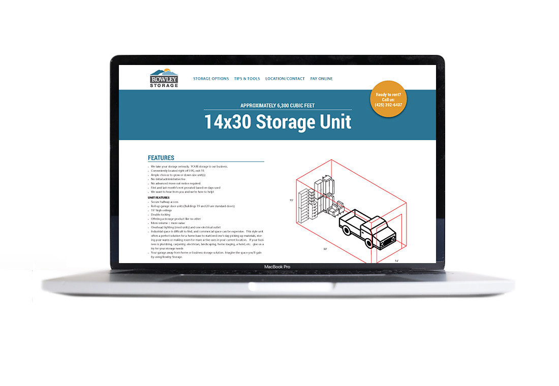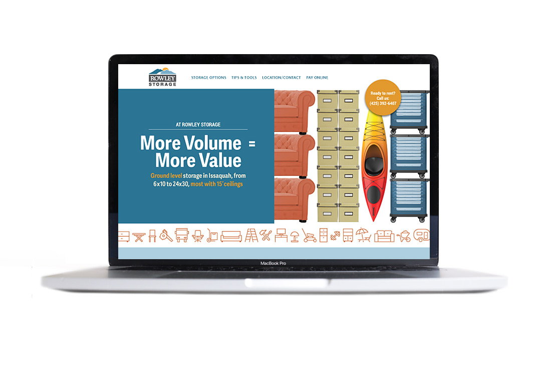 For Rowley's Self-Storage business we highlighted the 15' ceilings in their units with the headline "More Volume = More Value" and a series of home page animations that illustrate the concept. (The home page displays one of three animations randomly each time the page loads.) The unit pages feature 3D drawings meant to help customers visualize the space.
