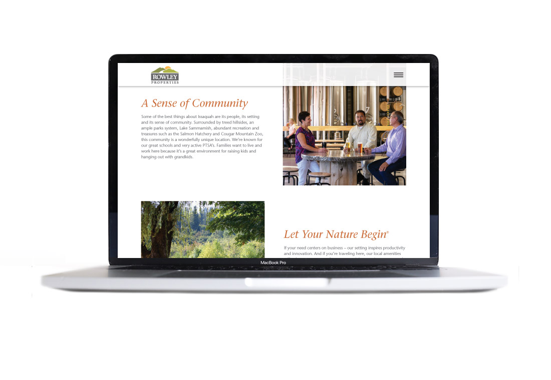 This Issaquah-focused, family-run property development and management company needed a refresh of their websites and identity. Rather than focusing entirely on the firm itself, we developed a strategy of selling Issaquah as a premium work/life destination, with Rowley as the host.